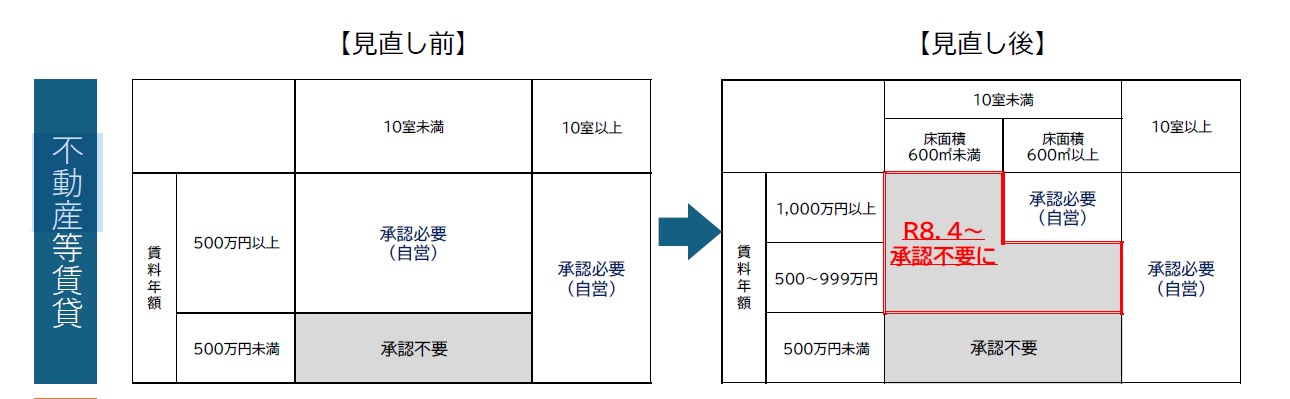 つまり「賃料年額 1,000万円以上」のゾーンについて、床面積600㎡を境に“承認要/不要”を分ける整理が入り、600㎡未満はR8.4から承認不要になる範囲が明確化された、というのが不動産賃貸パートの中心です。